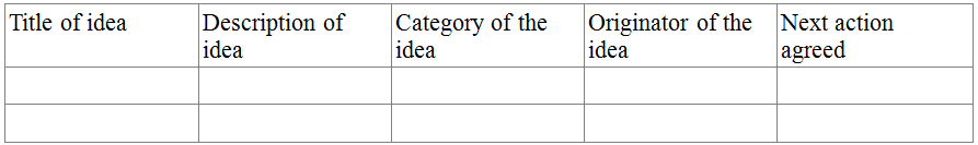 It is most important that a record is kept of the ideas generated at the invention harvesting session. A spread-sheet as defined here should be the minimum completed.